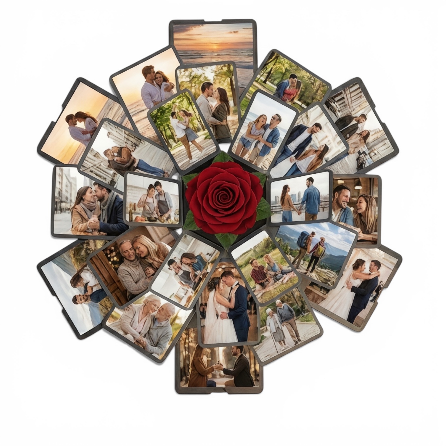 Jeśli chcesz stworzyć naprawdę spektakularny zestaw prezentowy, nasz Exploding Box idealnie komponuje się z naszą [wieczną różą w szkle LED]. Elegancka róża umieszczona obok pudełka wypełnionego zdjęciami tworzy spójną i luksusową kompozycję, która będzie cieszyć oko przez lata.