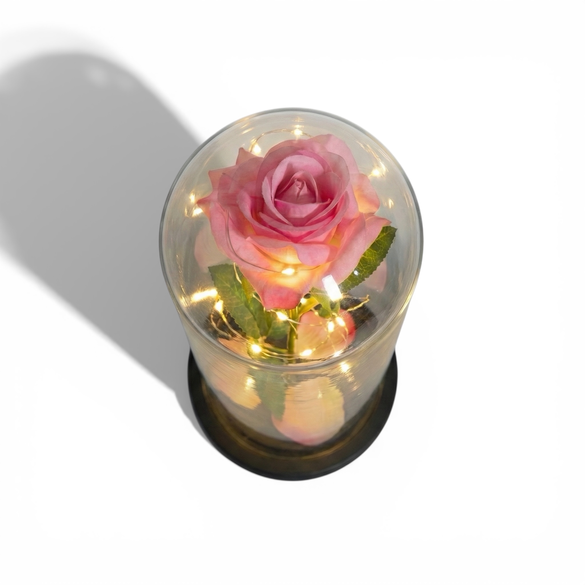 -Magiczny klimat: Wokół róży owinięty jest subtelny drucik z diodami LED. Po włączeniu, róża rozświetla się ciepłym, magicznym blaskiem, tworząc niesamowitą atmosferę w sypialni czy salonie.