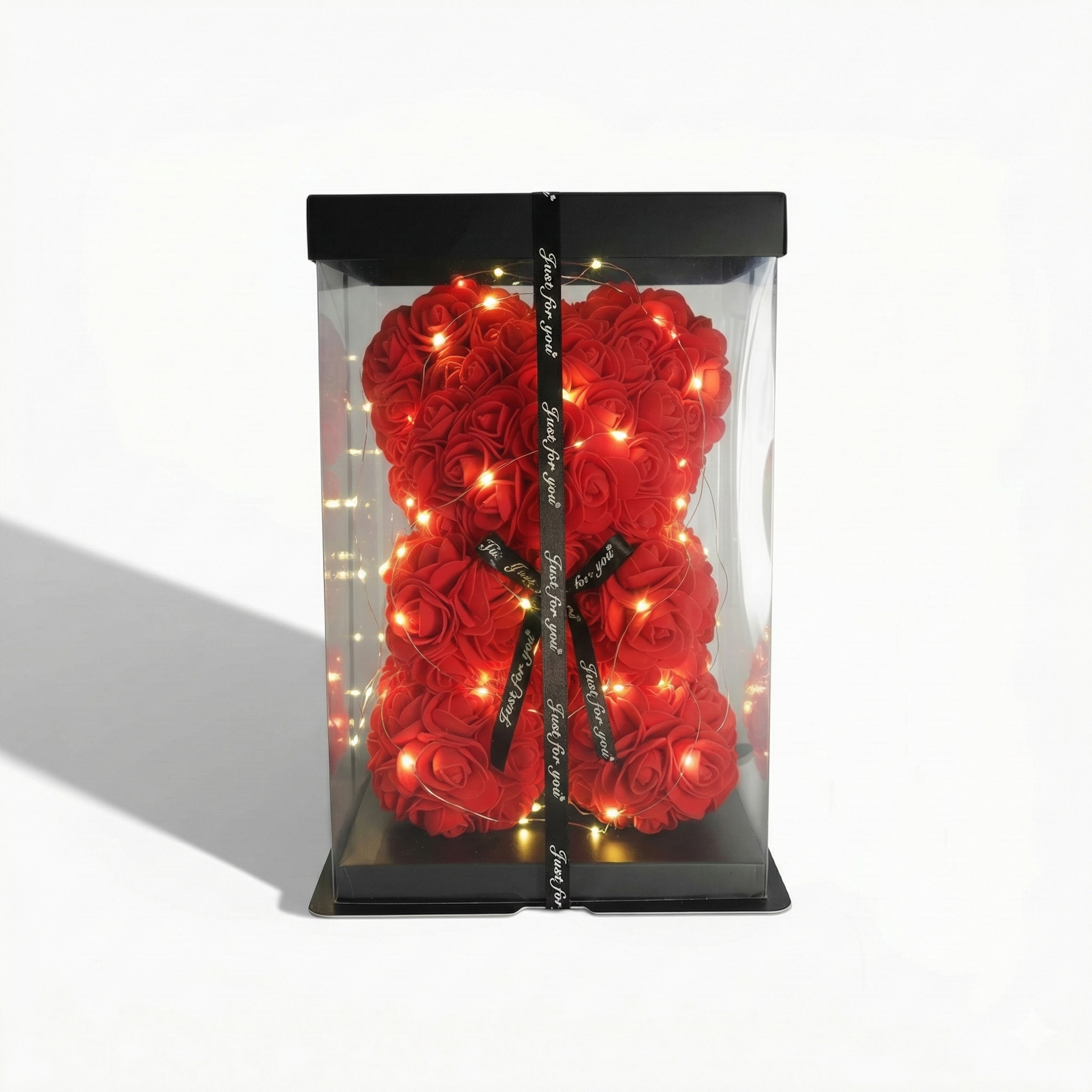 Eleganckie opakowanie: Miś znajduje się w przezroczystym pudełku prezentowym przewiązanym stylową, czarną wstążką z napisem „Just for you”, co czyni go gotowym do wręczenia prezentem.