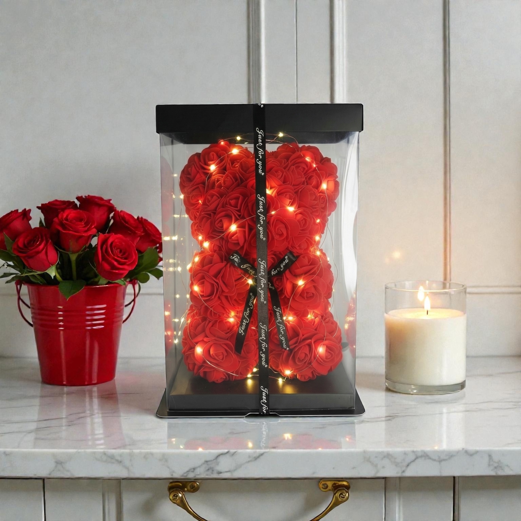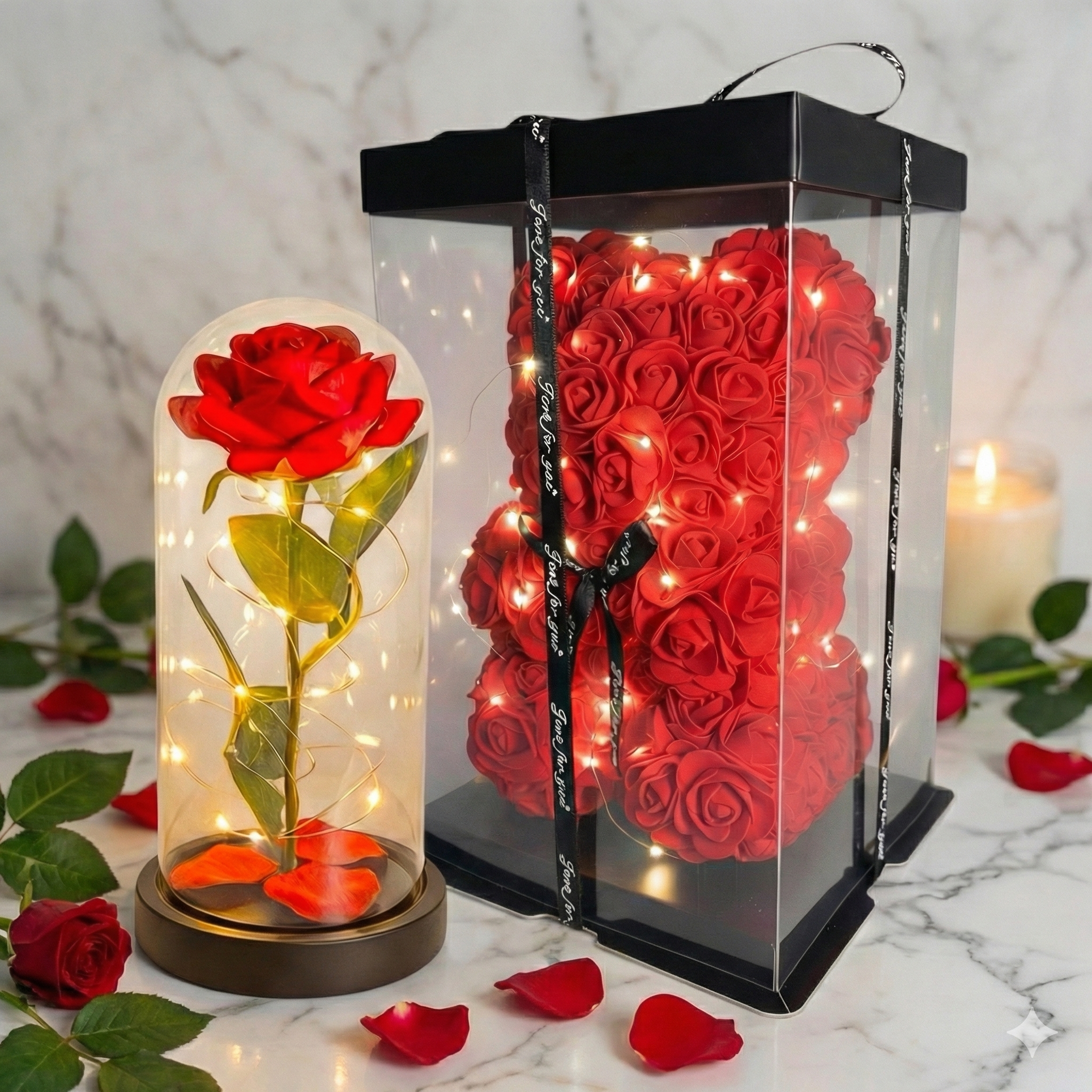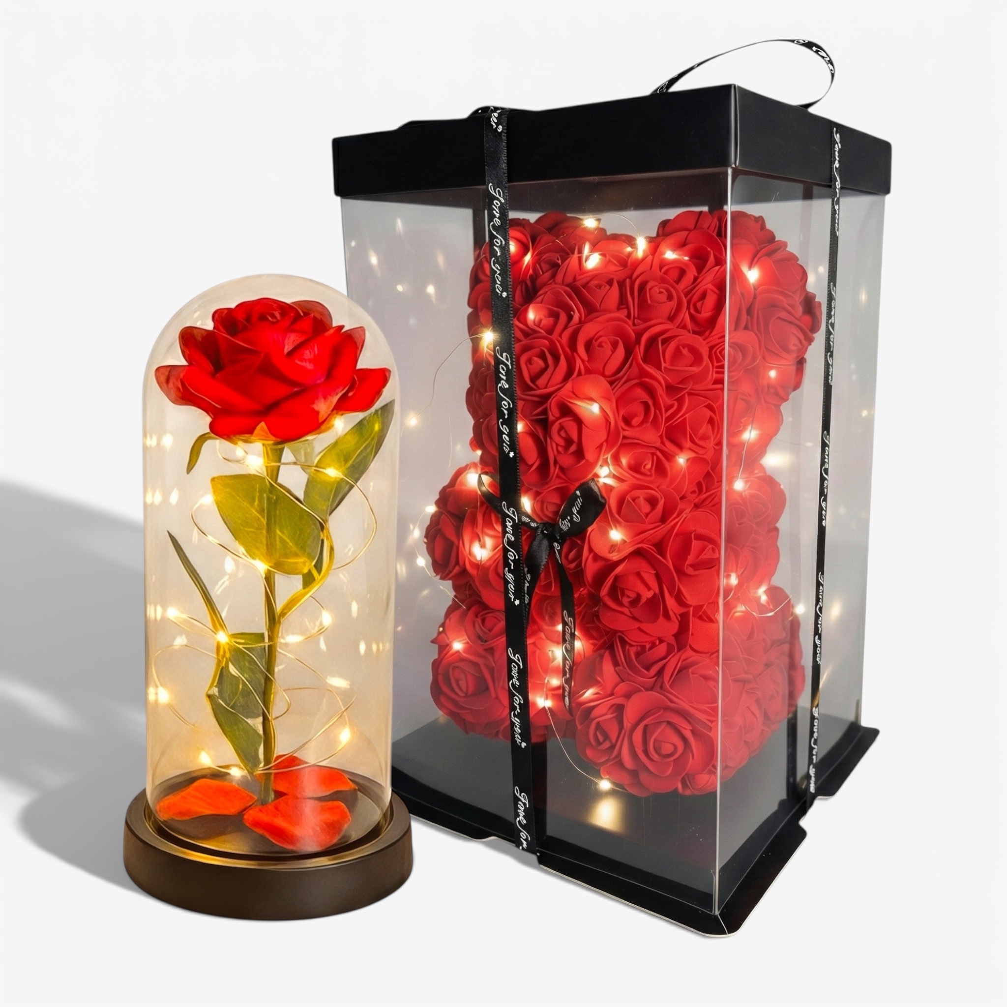 Zestaw-Wieczna Róża w szkle LED+Miś z Róż Czerwony – Idealny prezent dla ukochanej osoby, który nigdy nie zwiędnie. Nasz zestaw to połączenie dwóch najpopularniejszych trendów prezentowych ostatnich lat: klasycznej wiecznej róży inspirowanej „Piękną i Bestią” oraz uroczego misia wykonanego z piankowych różyczek. To idealny sposób, by powiedzieć „Kocham Cię” w nowoczesnym i eleganckim stylu.